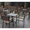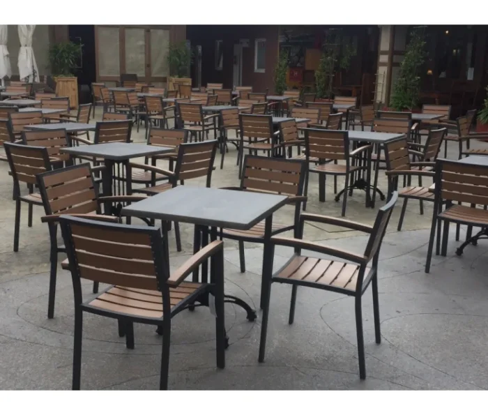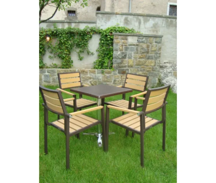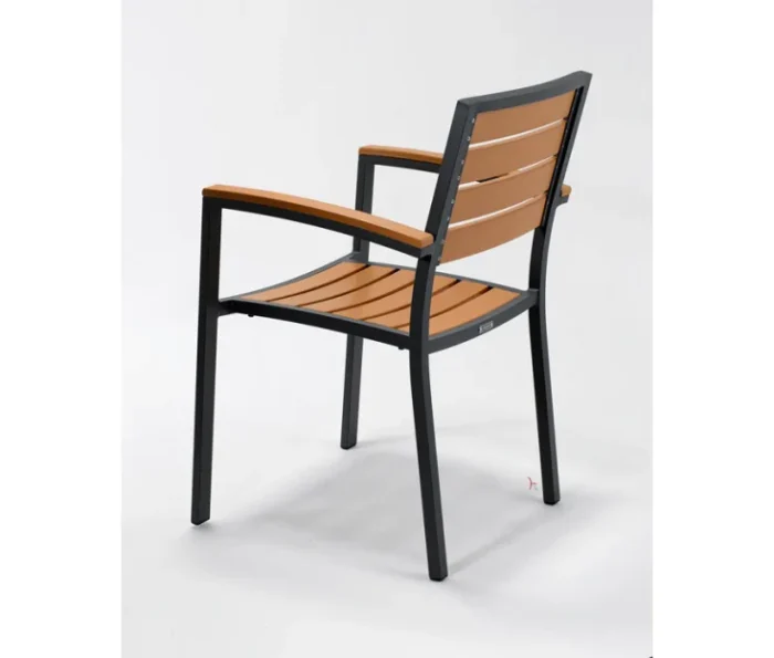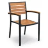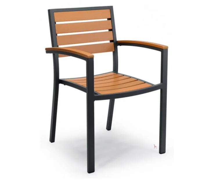 To je stolica izrađena od aluminijskog kućišta i letvica u imitaciji tikovine. Zbog visokokvalitetnih i izdržljivih materijala zaštićenih UV zaštitom, stolica je pogodna za vanjsku uporabu. Odličan je izbor za kućnu terasu nego za terase poslovnih poslovnica. Stolica se puni.